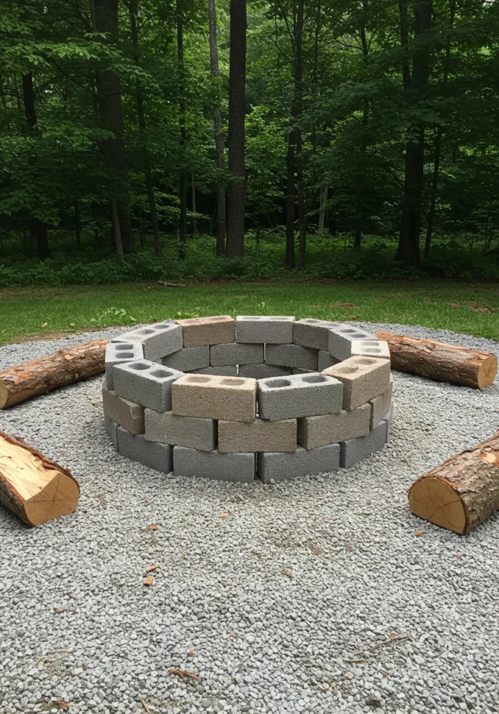 This setup is giving full-on campfire retreat vibes. The cinder block fire pit has a raw, unpolished charm with mismatched blocks stacked into a sturdy circular shape. It sits right on a gravel pad surrounded by thick log seating that looks freshly chopped and ready for storytelling. And that lush forest backdrop? Total perfection for anyone who loves a peaceful moment in nature.