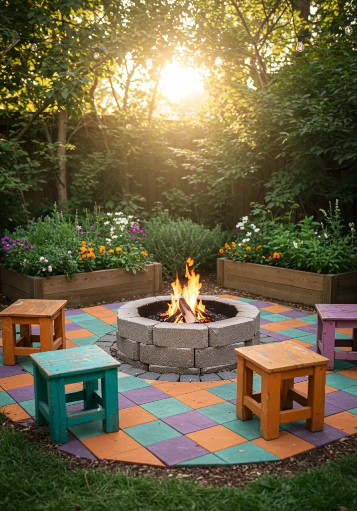 Whimsical Garden Fire Pit with Colorful Patio Tiles