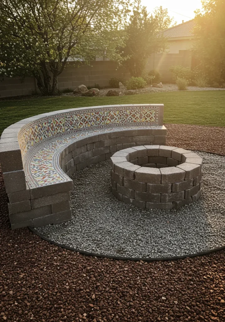 This backyard fire pit area is equal parts cozy and charming. The fire pit itself is made from natural-toned cinder blocks arranged in a snug circular shape, but the real showstopper here is the curved bench. It’s topped with beautiful mosaic tiles in earthy tones, full of playful pattern and personality. The gravel ground cover keeps the whole setup tidy and defined, while that golden sunset glow makes it all feel extra magical.