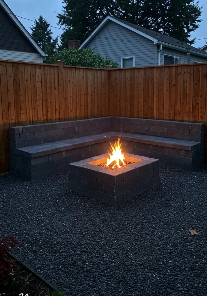 This backyard corner setup is sleek, simple, and seriously cozy. The square cinder block fire pit glows warmly against the deep charcoal tone of the matching L-shaped bench. The whole scene sits on a bed of dark gravel, which makes the firelight pop in the most dramatic way. The warm wooden fence behind it adds just the right touch of contrast and keeps things feeling private and intimate.