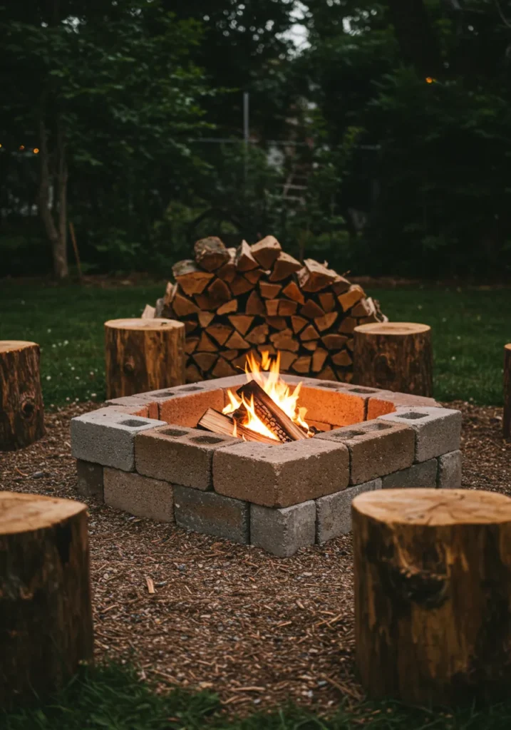 This rustic setup is all about keeping things simple and earthy. The square fire pit is built from basic cinder blocks in mixed neutral tones, giving it a charming, no-fuss look. Surrounding it are chunky tree stumps used as seats, each one perfectly imperfect. In the background, a tidy stack of firewood adds both function and that cozy cabin-in-the-woods feeling.