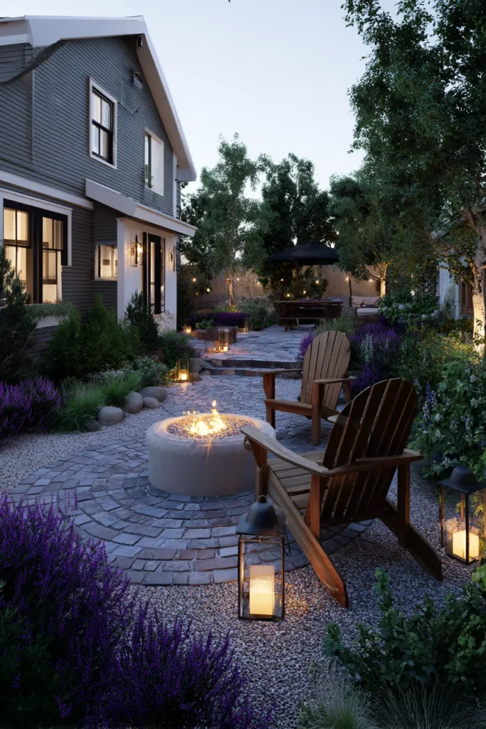 I think this look is just irresistibly romantic and cozy; it truly feels like a secret garden escape right in your own backyard. The way the fragrant lavender spills over the edges of the pavers is so charming, and the gentle glow from that fire bowl makes the entire scene feel like something out of a fairy tale. It’s the perfect spot for quiet evenings under the stars.