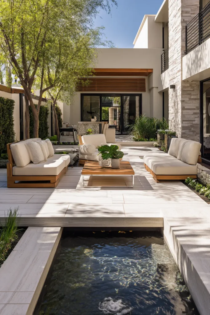 Talk about a five-star resort vibe! This stunning courtyard design is an absolute masterclass in sophisticated outdoor living. It features a large, plush neutral-toned sectional facing a sleek, low water feature or reflective pool, which adds a wonderfully serene element to the space. The patio is paved in large, light-colored tiles, and the clean, architectural lines are complemented by mature trees that provide natural shade. It’s an elegant, open-air living room.