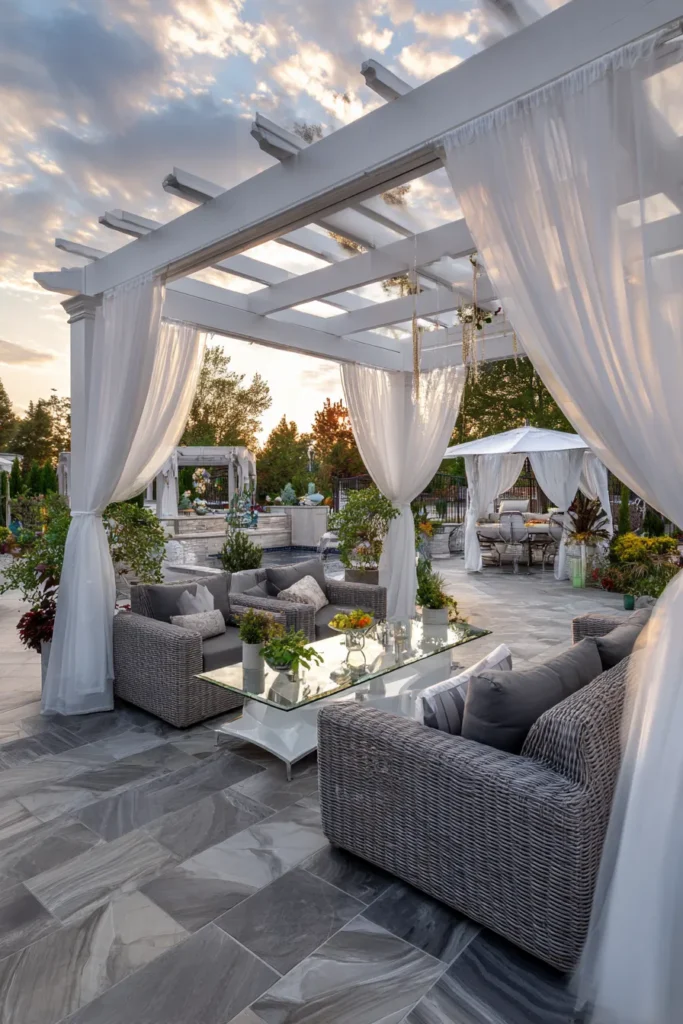 This patio is a picture of romantic elegance and airy comfort, perfect for creating a dreamy escape. A beautiful white wooden pergola defines the space, which is then made incredibly soft and private by flowing, sheer white curtains draped from the beams. Underneath, comfortable, gray woven chairs are arranged for conversation, set on a lovely dark stone patio. The drapery instantly transforms the area into a protected, intimate outdoor room.
