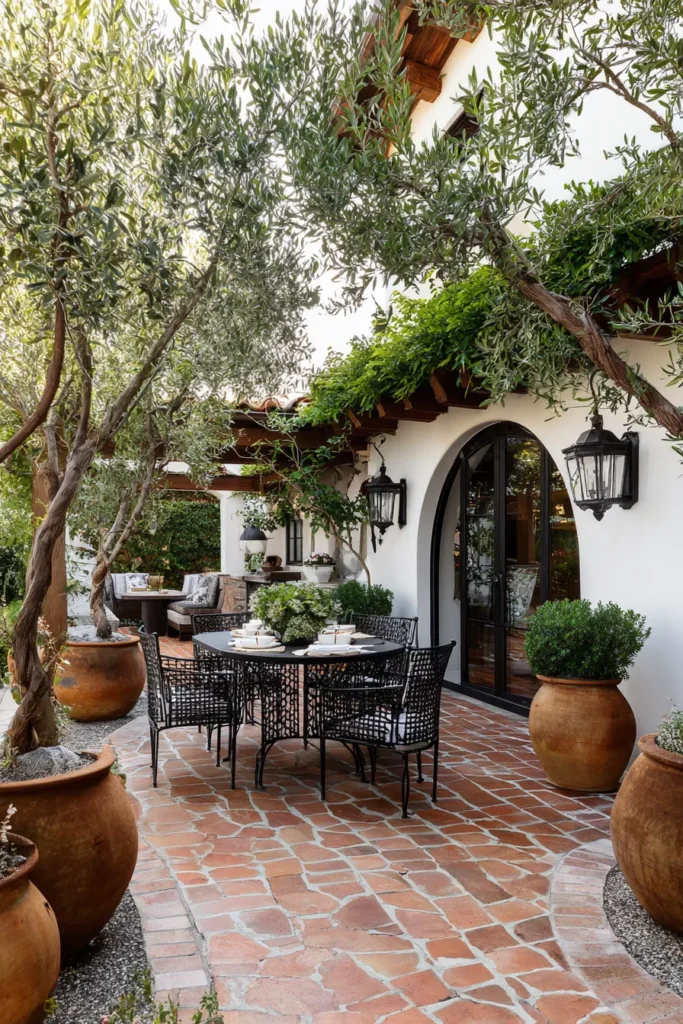 Step into a dreamy European courtyard with this stunning, Mediterranean-inspired design. The patio floor is covered in classic terracotta pavers that have a beautiful, sun-baked texture, perfectly complementing the rustic, whitewashed walls and charming dark wood doors. A simple wrought iron dining set is tucked into an arched alcove, surrounded by oversized terracotta pots filled with greenery. Mature olive trees provide a wonderful, natural canopy and a sense of timeless romance.