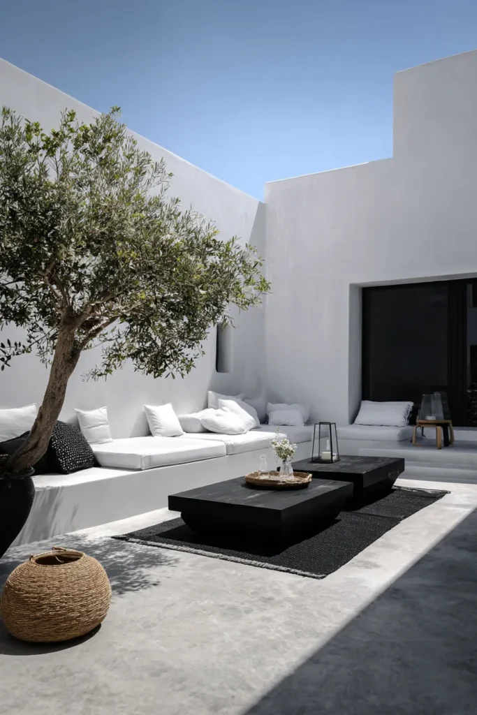 This design is the epitome of clean, modern minimalism with a distinct Mediterranean flair, showing how stunning simplicity can be. The space features stark white walls and a light concrete floor, creating a bright, airy backdrop for the bold, dark furniture. A beautifully mature olive tree stands as a magnificent natural centerpiece, casting lovely shadows. The low-profile, cushioned sectional is arranged around a dark, sculptural coffee table, defining a chic and calm lounge area.