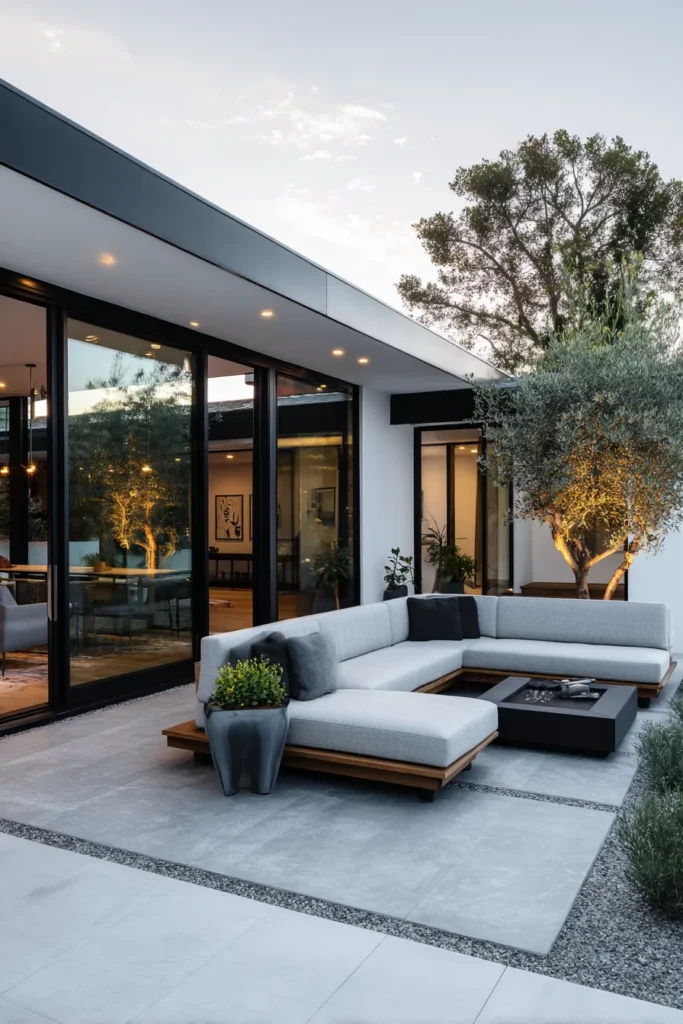 This patio design is all about breaking down the walls and creating a truly seamless extension of the interior. Large, floor-to-ceiling sliding glass doors connect the indoor space to a chic patio paved in large, light gray squares. The outdoor lounge area features a stylish, low-profile modular sectional in neutral tones, centered around an equally sleek fire pit. A stunning, mature olive tree in a simple planter brings height and life right up to the glass.