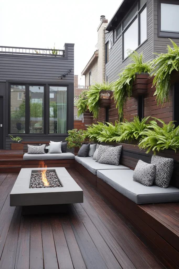 This cozy yet sophisticated space shows how to maximize a smaller urban backyard with clever design and vertical greenery. The patio is built on a beautiful, dark wood deck, which gives it a warm, rich foundation. A built-in, U-shaped banquette seating area is upholstered in light gray cushions, providing plenty of room for guests and is centered on a chic rectangular gas fire pit. Vertical garden walls add lush privacy and a pop of green against the exterior of the house.