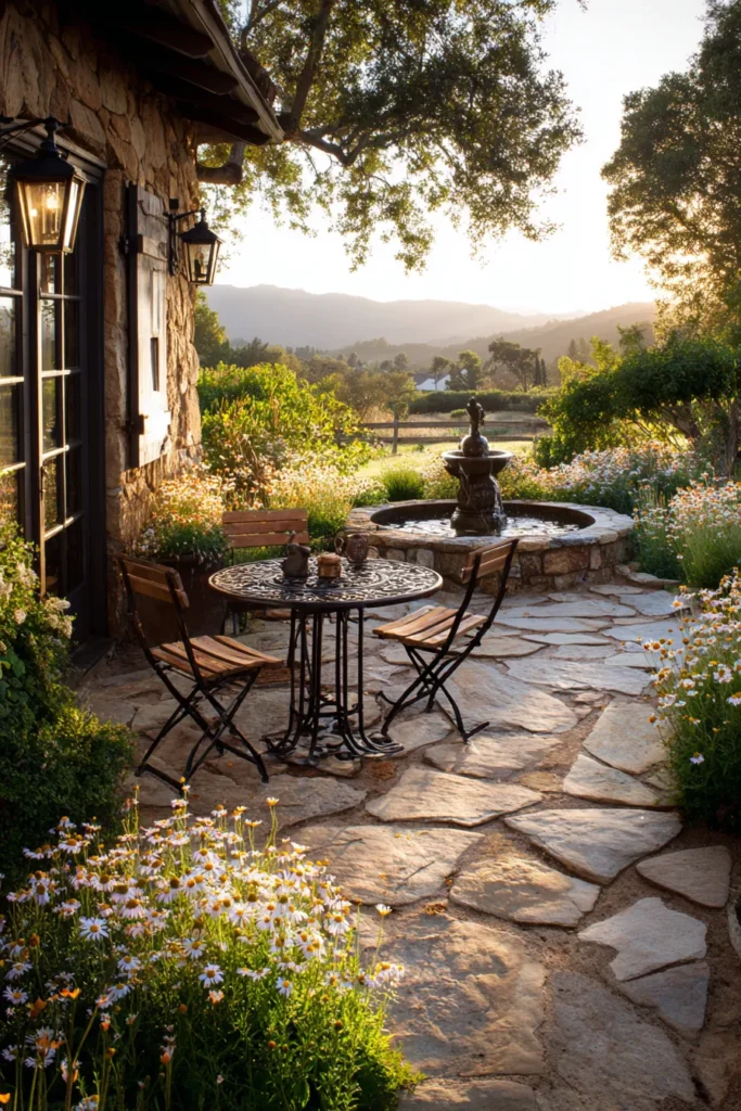 This is such a dreamy, picturesque patio that feels like it’s tucked away in the countryside. The floor is made of beautiful, irregular flagstone pavers that lend a wonderfully organic and natural texture to the space. A classic wrought-iron bistro set is perfectly positioned to enjoy the gentle sounds of a small, charming garden fountain placed nearby. The surrounding lush, sun-drenched landscaping and the hint of rolling hills in the background create a truly idyllic and peaceful setting.