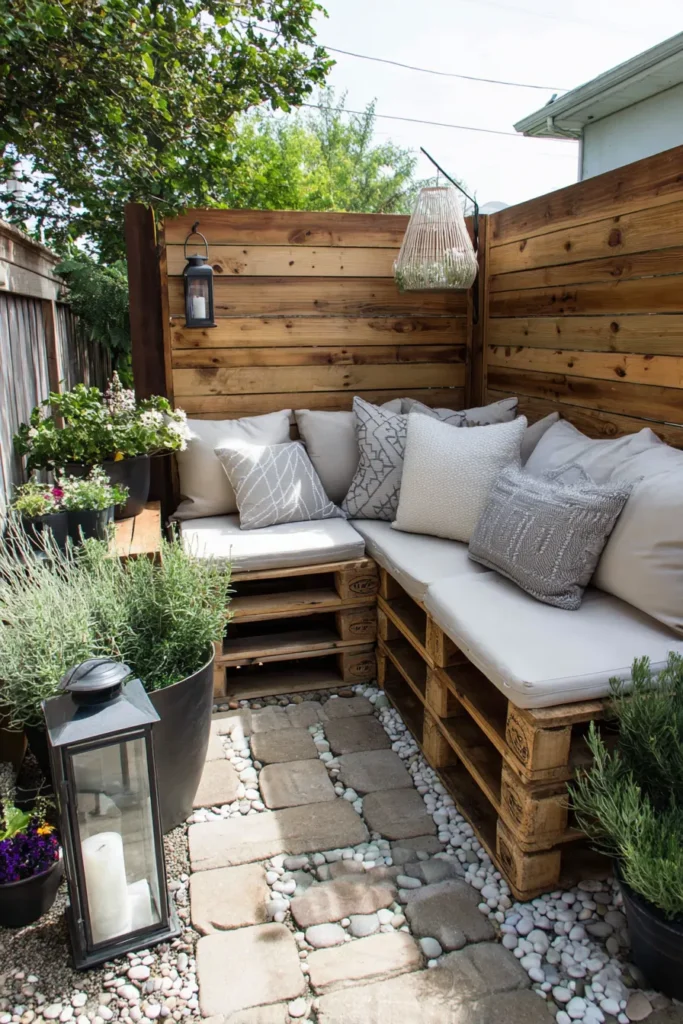 This design is a fantastic example of a clever and budget-friendly DIY solution for a smaller outdoor space. The cozy corner seating is built from repurposed wooden pallets, creating a unique L-shaped bench that is topped with plush, neutral-toned cushions. A slatted wooden privacy wall provides a warm, natural backdrop, and the flooring is a mix of small pavers and gravel. This is a wonderfully intimate and personalized spot perfect for city backyards.