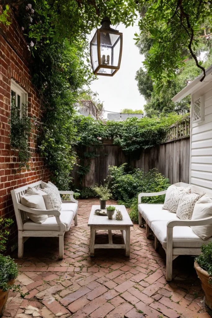 This enclosed patio is a beautiful nod to classic, historic garden design with its intimate, high-walled setting. The floor is covered in warm red brick pavers laid in a charming pattern, providing a wonderfully traditional foundation. The walls are covered in lush, climbing green ivy, which adds incredible texture and a sense of old-world charm, and a large, striking dark metal lantern hangs overhead. Simple white outdoor furniture keeps the focus on the surrounding greenery and classic architecture.