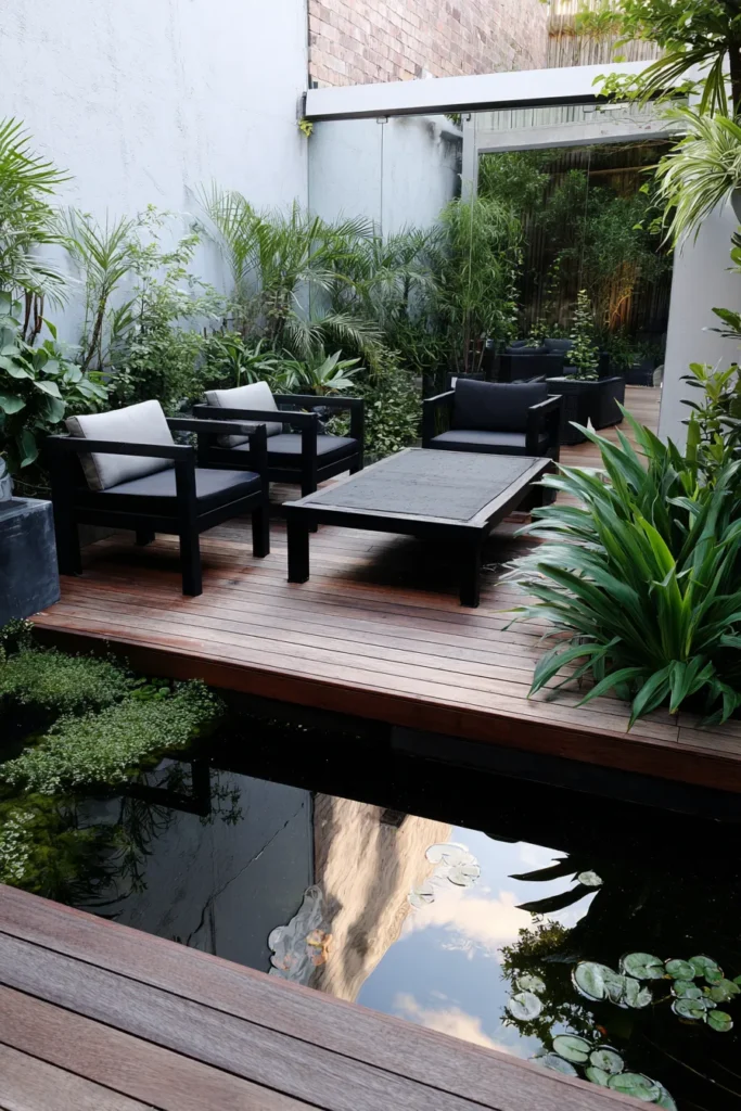 This patio area leans into a clean, contemporary aesthetic with its rich, dark wood decking and bold black furniture. The design perfectly blends nature and modern living by incorporating a sleek, rectangular reflective pond or water feature right next to the seating area. Tropical-style plants and tall, private walls give the space a very secluded, resort-like feel. The seating itself is minimal and chic, offering a great spot to enjoy the calming sight and sounds of the water.