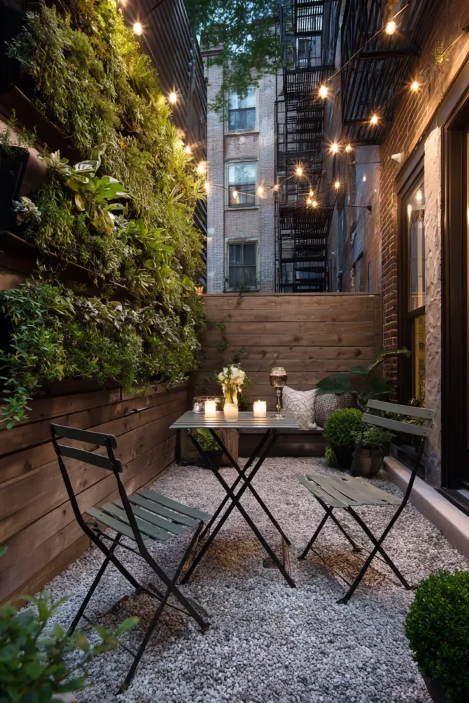 I find this design to be absolutely brilliant for small, urban areas—that towering green wall adds so much life and drama without taking up any floor space. The contrast between the dark, moody vertical wall and the cheerful twinkle of the string lights is just perfect, creating a truly intimate and sophisticated evening atmosphere. It’s the ultimate inspiration for creating a lush oasis in a compact space.