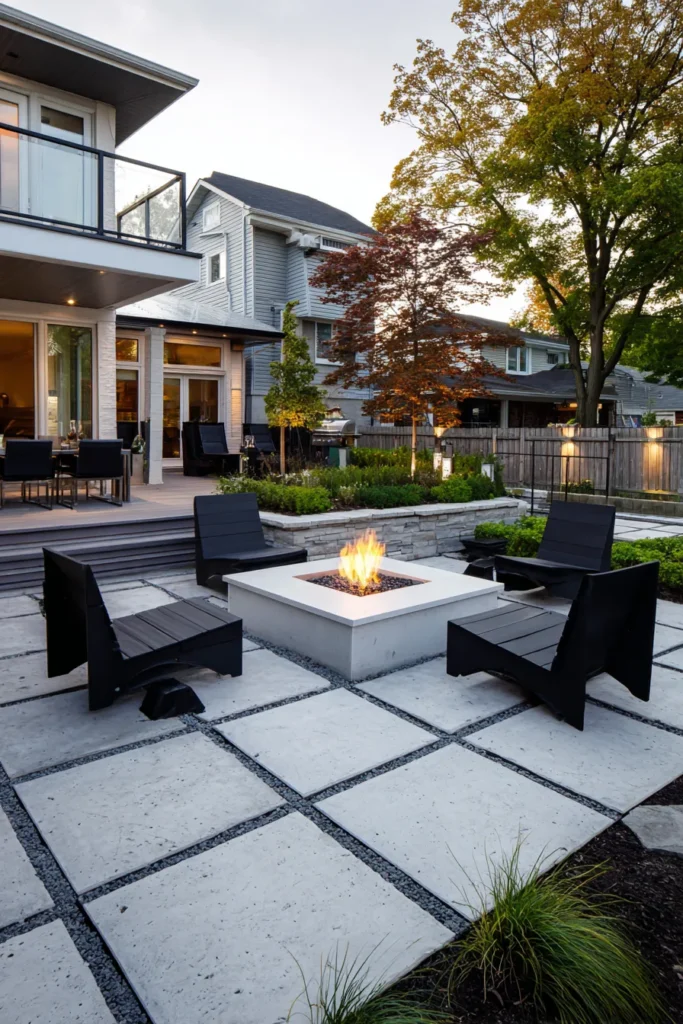 I am completely in love with the bold, graphic feel of this patio; it’s so clean and architectural, which is perfect for anyone who loves a modern aesthetic. The way those large pavers are laid out is simply brilliant for making the space feel expansive and intentional. It’s the ultimate spot to gather friends for a sophisticated evening under the stars, feeling super chic while you toast some marshmallows.