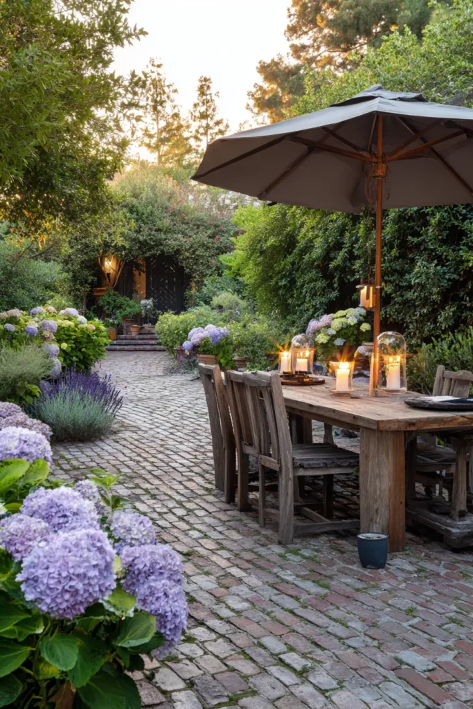 This charming backyard space is straight out of a beautiful English cottage garden, focusing on natural beauty and soft textures. The long path and dining area are paved with traditional red brick, giving the space a wonderful, historic warmth. The sides of the path are lined with lush, overflowing hydrangea bushes and other colorful, mature plantings, creating a feeling of walking through a beautiful floral tunnel. A rustic wooden dining table is shaded by a classic umbrella, inviting long, leisurely lunches.