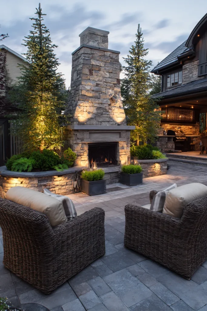 Talk about making a statement! This backyard space centers around a truly magnificent outdoor fireplace built with beautiful, stacked natural stone that goes all the way up. The area is framed by tall evergreens and soft, tiered landscaping lit up by strategic up-lighting that really highlights the textures of the stone. Comfortable, woven all-weather chairs sit right by the fire, ready for cozy conversation, while planters filled with greenery soften the edges of the patio.
