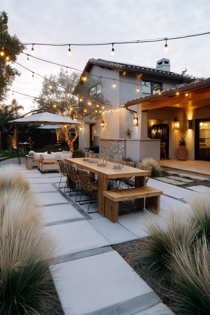 This patio is definitely the one that makes me want to start planning my next big dinner party immediately! I love how open and inviting it is, with that perfect mix of natural materials like the wood table and the soft, feathery landscaping. The glow of those simple string lights creates such an incredible ambiance that just feels so festive and effortless.
