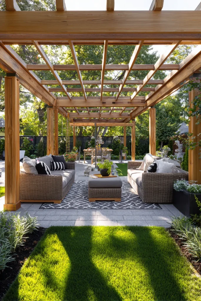 I find this design incredibly impressive because it perfectly defines an outdoor room, making it feel just as intentional and stylish as any living room inside the house. The symmetry and the strong lines of the pergola are so appealing, and I love how it makes the entire space feel protected and completely ready for year-round lounging or hosting a crowd.