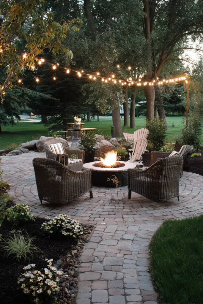 This is the quintessential cozy backyard hangout, designed for those crisp fall evenings. The space is anchored by a charming circular stone patio with a slightly curved edge, perfect for framing the central, rustic stone fire pit. Comfortable, deep-seated wicker chairs are placed around the fire, just waiting for s’mores and storytelling. Overhead, a classic strand of bistro lights drapes between the surrounding mature trees, adding that magical, warm glow to the entire scene.