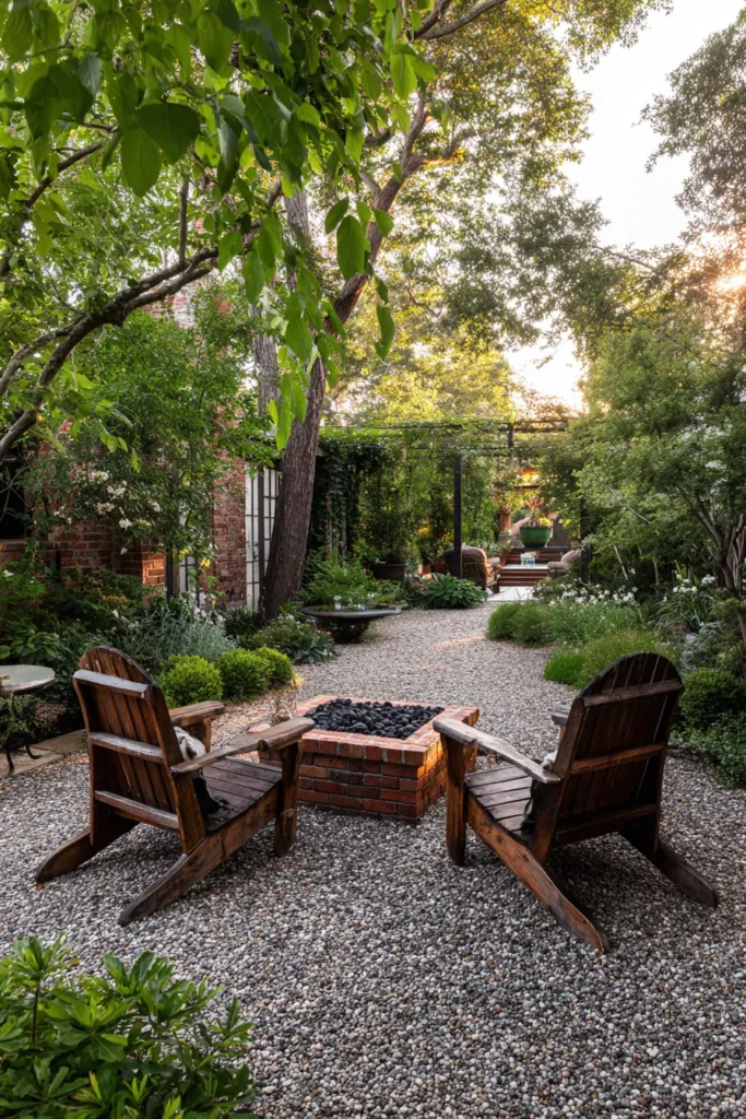 Here’s a beautiful example of how less can totally be more, especially if you love a natural, rustic feel. This inviting space uses a simple gravel base instead of traditional pavers, which gives the area a wonderfully casual and organic texture. Two classic wooden Adirondack chairs are perfectly positioned around a small, low fire pit, making it the ideal spot for quiet reflection or a heart-to-heart chat. The surrounding beds are filled with drought-tolerant grasses and plants, creating a serene, low-maintenance garden escape.