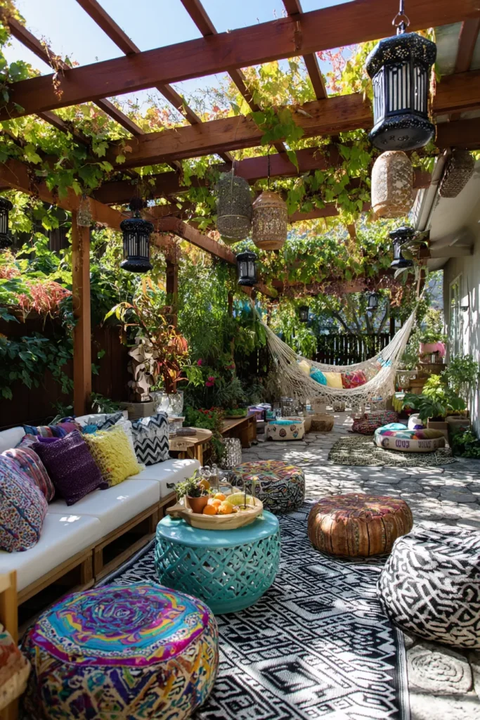 Get ready for the ultimate cozy boho-inspired backyard hideaway! This space is dripping with personality, featuring a covered pergola draped with an abundance of hanging plants and greenery. The seating area is a vibrant mix of a cushioned bench, fluffy pillows, and colorful patterned poufs that are scattered over a bold, geometric rug. The look is completed with a relaxing macramé hammock and a few quirky, oversized lanterns, creating a truly eclectic and layered aesthetic.