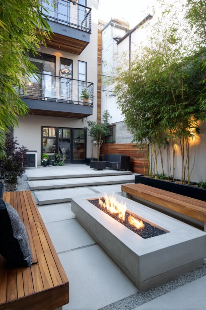 This design showcases a perfectly chic and minimalist approach to a modern urban patio. The main feature is a long, low rectangular fire pit made from smooth concrete, which is cleverly integrated into a matching built-in bench for seamless seating. Large, light-colored pavers create a clean, organized floor, while tall bamboo and subtle landscape lighting add a touch of green and privacy around the edges. It’s a beautifully tailored outdoor space that maximizes every inch.