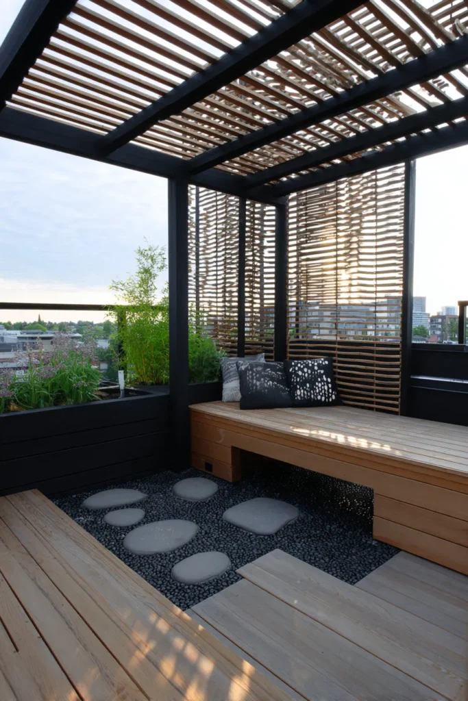 This incredibly calming balcony design creates a peaceful Japanese-inspired retreat using natural elements and thoughtful layout. The space features a structured black metal pergola with wooden slats overhead, offering adjustable light and shade, while the sides are enclosed with beautiful woven reed screens for privacy and texture. The flooring combines warm, light-toned natural wood decking with an insert of smooth, dark pebbles and large, round stepping stones, creating a beautiful zen garden effect. A built-in wooden bench with graphic black-and-white pillows maximizes the seating area, while dark planters filled with delicate greenery complete this serene, sophisticated urban oasis.