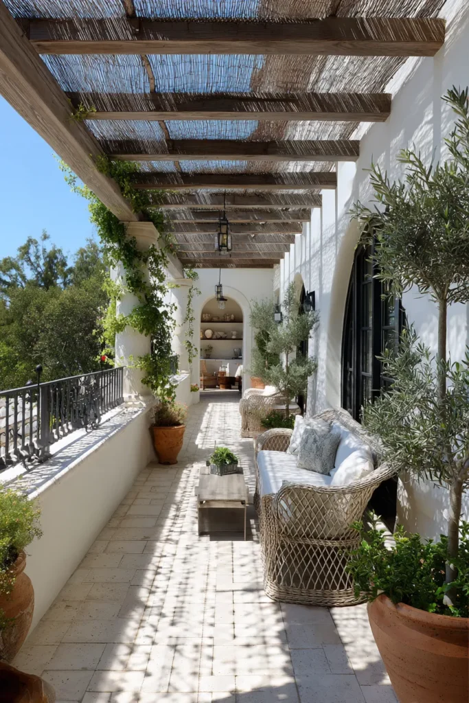 This breathtaking loggia-style balcony transports you straight to a sun-drenched villa in the Mediterranean, embracing classic textures and a serene aesthetic. The long, narrow space is covered by an absolutely gorgeous wooden beam pergola that features natural reed or bamboo matting on top, creating that perfect dappled light pattern on the tiled floor. White stucco walls and beautiful archways provide a classic backdrop, while the wrought-iron railing adds a delicate touch of old-world charm. Wicker seating, small olive trees in terracotta pots, and climbing ivy create a lush, natural atmosphere that feels incredibly serene.