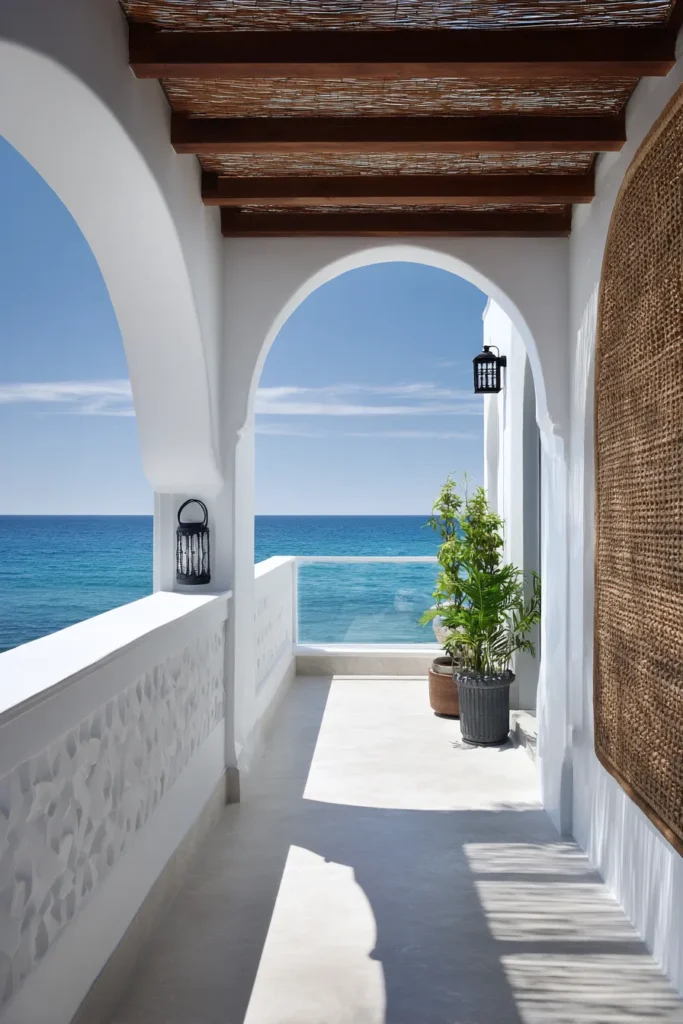 This breathtaking balcony design instantly transports you to the Greek Isles, featuring a stunning Santorini-inspired aesthetic that is both clean and incredibly romantic. The space is defined by smooth, crisp white stucco walls and beautiful arched openings that perfectly frame the endless blue of the sky and ocean. The overhead pergola is simple yet effective, consisting of dark wooden beams topped with natural woven matting to create a wonderfully textured, shaded area. A decorative carved relief panel on the railing adds a subtle layer of artistry, while a frameless glass balustrade at the end ensures an unobstructed, jaw-dropping view.