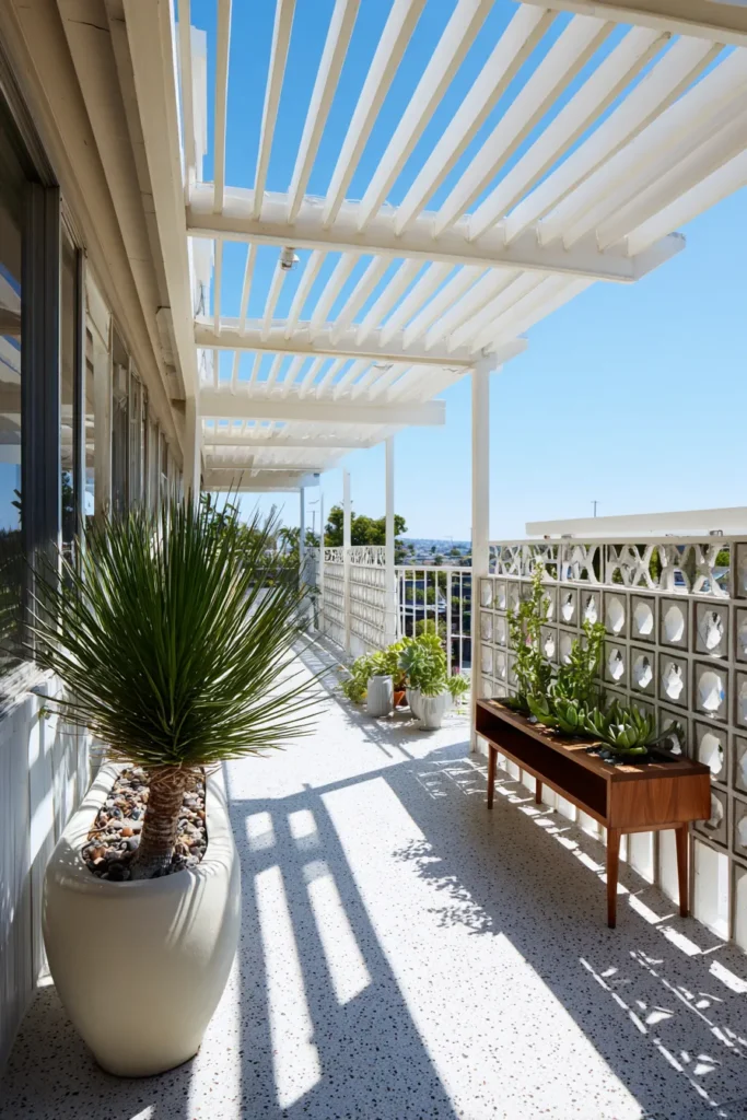 This vibrant balcony perfectly captures the bright, optimistic feel of Mid-Century Modern design, making it feel like a luxurious, retro-inspired sun deck. The defining feature is the crisp, white slatted pergola, which casts those beautiful geometric shadow stripes onto the terrazzo-style flooring. Adding to the vintage charm is the stunning white decorative breezeblock screen that provides privacy and texture without blocking the airflow completely. The space is softened with beautiful, contemporary planters, including a large white egg-shaped pot holding a dramatic palm and a sleek, low wooden planter filled with succulents.