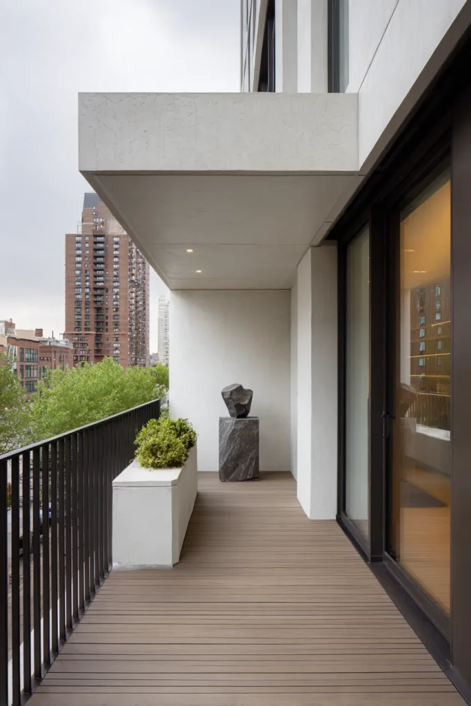 This urban balcony champions a clean, minimalist aesthetic, proving that simplicity can be incredibly sophisticated. The space uses the building’s architecture as its overhead shelter; the ceiling acts as a flat, modern pergola, offering full protection and featuring discreet recessed lighting. The flooring is warm, horizontal wood-look decking, which beautifully contrasts with the stark white stucco walls and the sleek, dark metal railing. The design is kept intentionally sparse, focusing attention on a long, low integrated planter and a striking, sculptural art piece that adds a touch of gallery-like elegance.