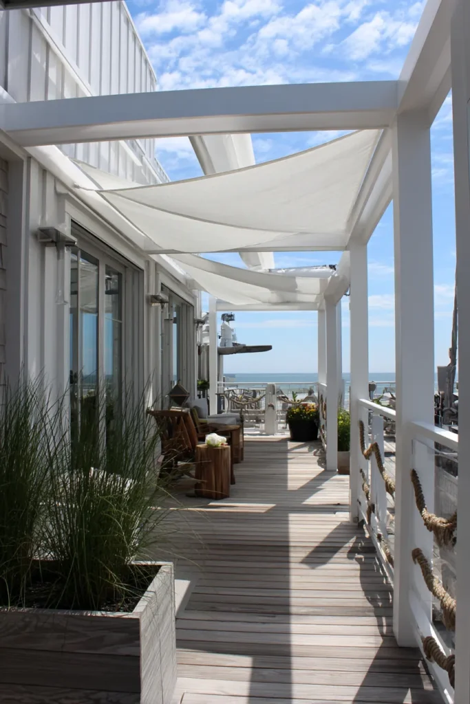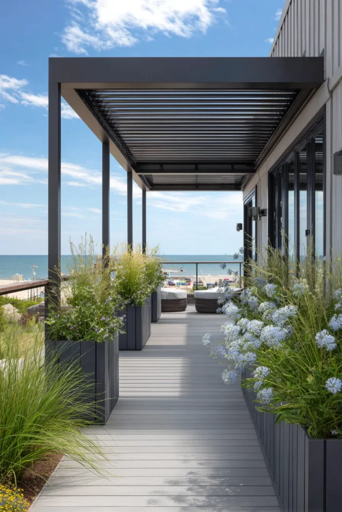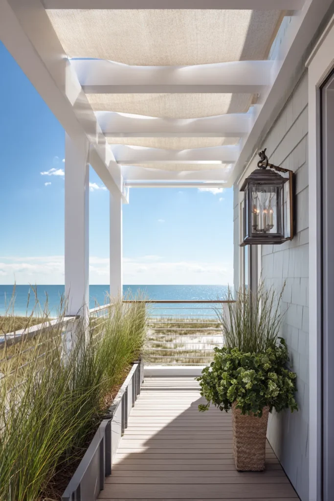 This incredible balcony offers a tranquil pathway directly to the mesmerizing ocean, beautifully blending a clean, modern aesthetic with natural elements. A bright white pergola stretches across the space, featuring a unique and airy fabric canopy that creates soft, diffused shade—perfect for those sunny beach days. The minimalist design is accentuated by elegant wire railings that keep the focus on the endless blue horizon. Along one side, slender planters filled with tall, native grasses add a touch of untamed, natural beauty, mirroring the dunes just beyond. A classic lantern on the wall provides a welcoming, warm glow for evenings.