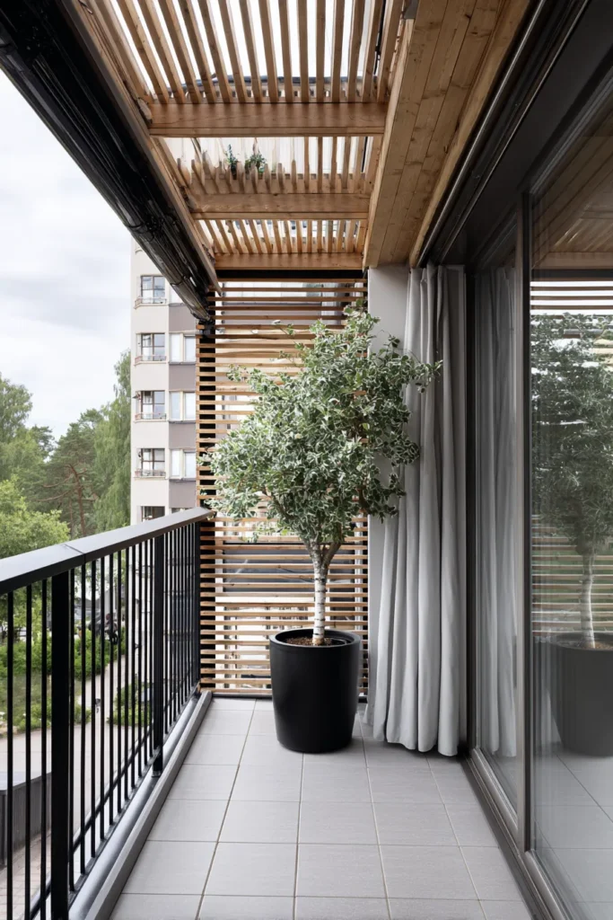 This sleek, narrow balcony is a masterclass in maximizing privacy and style in a high-density urban setting. The design beautifully combines natural materials with modern features, highlighted by a fantastic wooden pergola system. The pergola uses a dual-layer approach, with fixed wooden slats creating texture and a transparent roof panel underneath for weather protection. The walls feature additional horizontal wooden slats that act as a stylish screen, maintaining privacy while letting light filter through. The look is grounded by a simple gray tiled floor, a bold black metal railing, and soft gray floor-to-ceiling curtains that complete this serene, Scandinavian-inspired retreat.