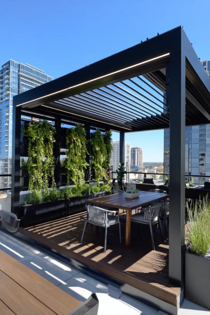 This stunning rooftop terrace transforms a high-rise space into a truly luxurious outdoor dining room, using a bold, architectural approach. The space is defined by a massive, matte black metal pergola that features horizontal louvered slats overhead for perfect shading. The pergola also includes integrated strip lighting along the beams, which is fantastic for evening use. The most impressive feature is the living green wall made of cascading plants mounted directly onto the back of the structure, creating a lush, vertical garden. Set atop warm wood decking, the space is furnished with a sleek dining set, making it the ultimate spot for al fresco meals with an incredible view.