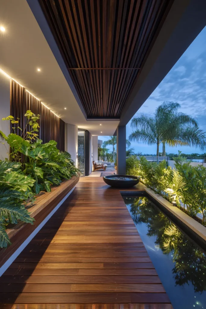 This extraordinary lanai or covered balcony transforms a walkway into a lush, five-star resort experience. The entire space is defined by its rich, dark hardwood decking that stretches out and perfectly contrasts with the smooth, cool-toned walls. Overhead, the integrated pergola ceiling features striking dark wood slats, creating incredible visual texture and giving the long space an amazing sense of depth. The true showstopper is the linear reflecting pool that runs along one side, bordered by built-in planters overflowing with lush, tropical greenery that is beautifully highlighted by warm, low-level lighting. A sleek, black water bowl feature completes this serene design.