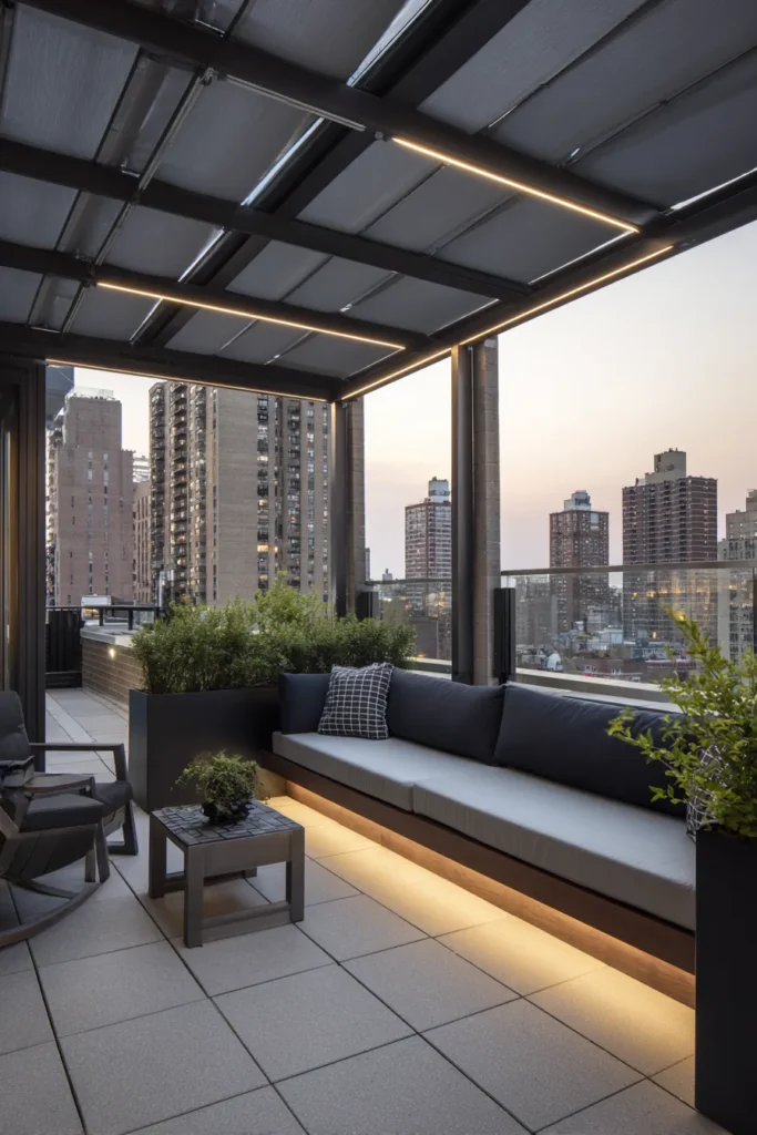 This sophisticated high-rise balcony maximizes its small footprint to create a luxurious and private outdoor lounge with an amazing city view. The defining feature is the sleek, dark metal pergola, which is fitted with a retractable or fixed fabric canopy for full overhead protection. The structure also boasts integrated linear LED lighting along the beams, which adds a stunning, dramatic glow after sunset. The space is anchored by a custom built-in bench with plush cushions and soft under-bench lighting, creating a cozy and welcoming atmosphere. Dark, low planters filled with structured greenery add a vital touch of nature to this chic urban setting.