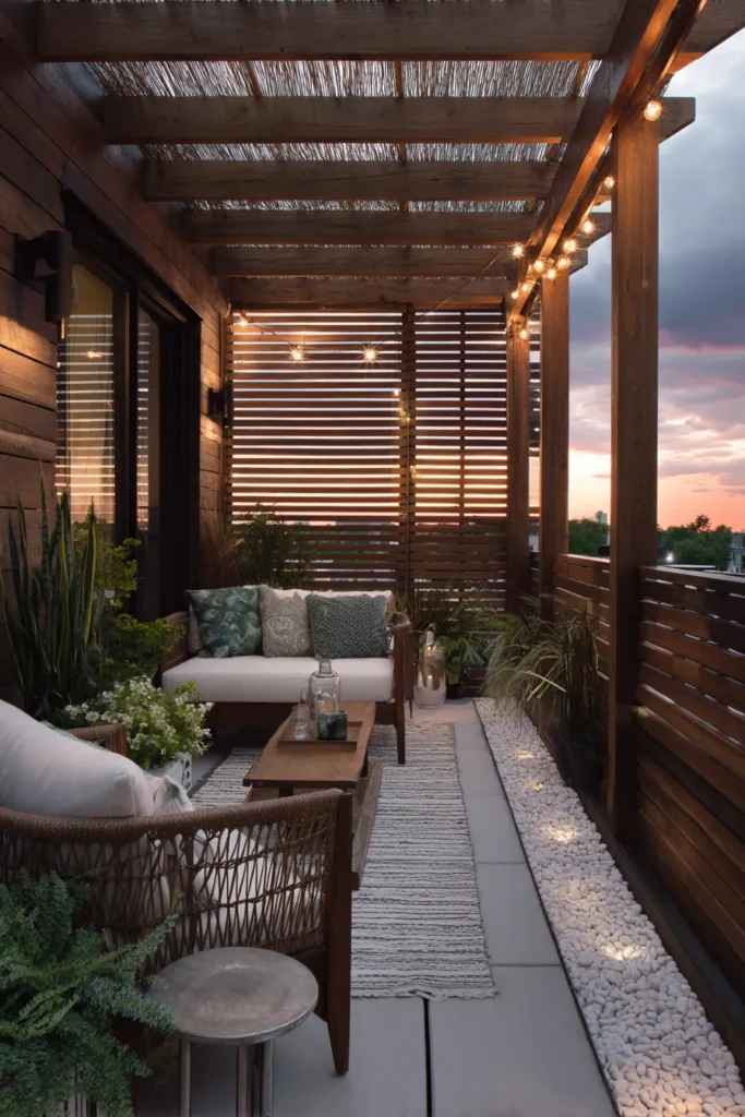 This design is the ultimate inspiration for transforming a narrow balcony into a true outdoor living room with serious bohemian flair. The entire space is wrapped in rich, warm-toned dark wood paneling, creating a private, cocoon-like atmosphere. The centerpiece is the multi-layered pergola, featuring sturdy wooden beams topped with a natural reed or bamboo screen, which provides fantastic dappled shade and texture. Notice the clever use of vertical slatted screens for privacy and the string lights hung from the pergola that add a magical glow, making this space feel intimate and ready for evening relaxation. The use of white river rocks along one edge creates a mini zen garden feature, while the woven textures of the furniture and rug complete the relaxed, earthy aesthetic.