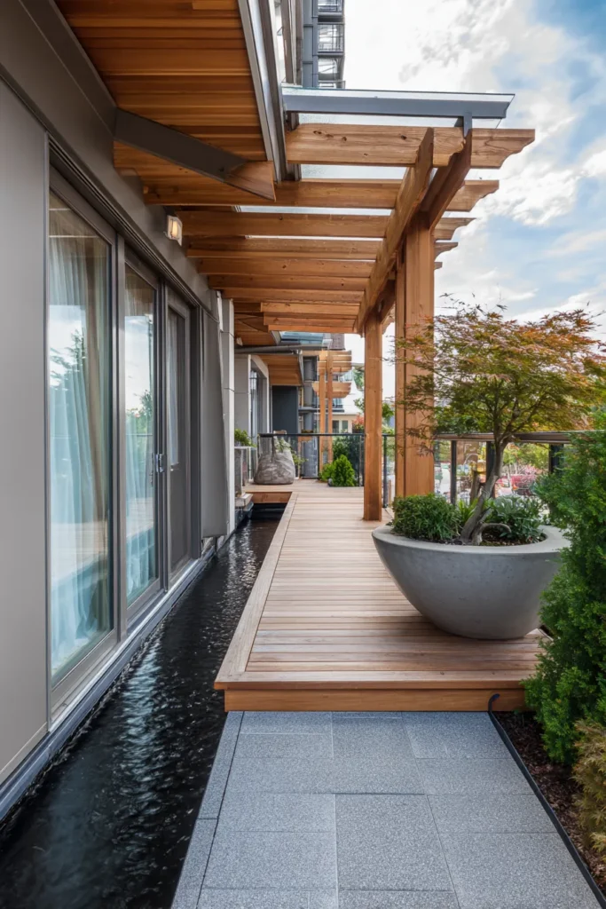 This truly inspired balcony design transforms a simple outdoor space into a lush, spa-like retreat, expertly using natural materials and a calming water element. The space is anchored by a stunning light wood pergola featuring thick, rustic beams and slatted construction, which provides beautiful, warm texture and filtered light. The flooring is a raised light-toned wood deck, which contrasts beautifully with the dark granite tiles at the entrance. The most striking element is the long, narrow recessed water feature running along the building’s edge, adding the soothing sound and reflection of running water. A large, contemporary concrete bowl planter holds a delicate tree, completing the modern-zen aesthetic.