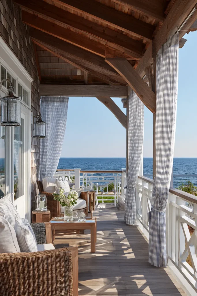 This breathtaking balcony embodies the ultimate coastal living dream, offering an unobstructed panoramic view of the sparkling ocean. The design features a beautifully rustic yet refined exposed wooden beam pergola that extends over the entire length of the balcony, providing a sense of grandeur and natural elegance. Crisp white and blue striped curtains can be drawn for privacy or shade, fluttering gently in the sea breeze, which adds a touch of resort-like luxury. The traditional white railing with classic cross-detailing perfectly frames the vast seascape. Cozy wicker furniture, plush cushions, and decorative lanterns complete this idyllic scene, creating an outdoor haven that is both sophisticated and incredibly inviting.