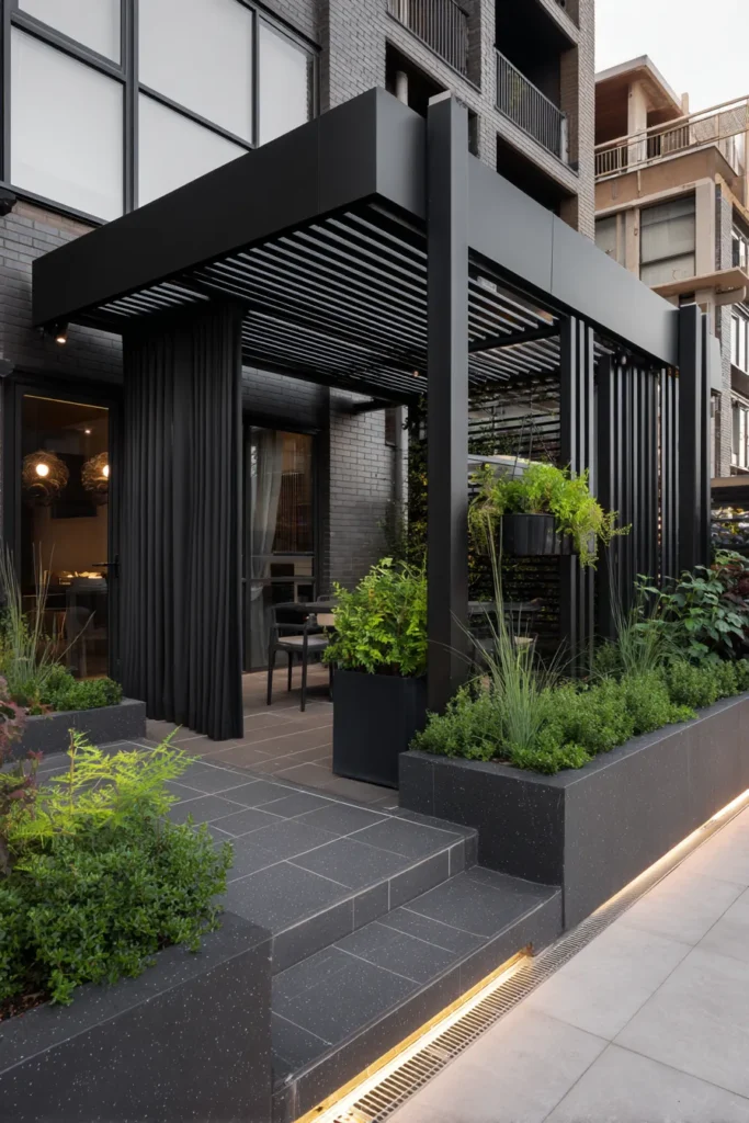 This spectacular design is the epitome of modern urban luxury, utilizing a striking, monochrome palette for maximum impact. The entire space is anchored by a sophisticated, all-black metal pergola that features clean, sharp lines and horizontal slats for perfect overhead shading. Vertical slats and deep black fabric curtains provide incredible privacy, transforming the balcony into a chic, enclosed outdoor room. The design incorporates tiered black planters filled with lush greenery and overflowing plants, creating a high-contrast urban garden. Low-level accent lighting is integrated into the planters, adding a warm, sophisticated glow perfect for nighttime entertaining.