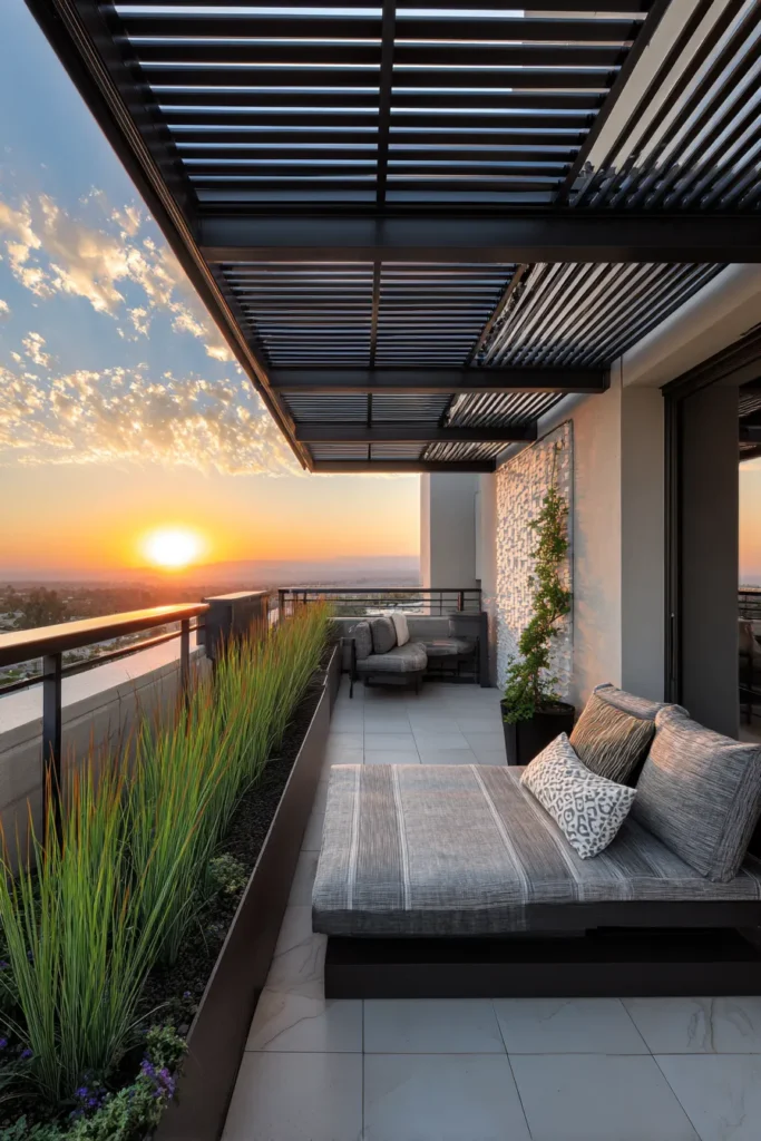 This luxurious high-rise balcony perfectly blends comfort with cutting-edge design, making the most of a breathtaking panoramic view. The space is covered by a sleek, modern bioclimatic pergola, recognizable by its adjustable louvered slats in a dark, clean-lined frame, offering customizable shade and weather protection. The design incorporates a long, low metal planter filled with tall, wispy grasses that create a stunning natural screen and add movement to the space. Featuring comfortable, low-profile lounge furniture in chic gray tones and a decorative stone accent wall, this balcony is truly a masterful example of elevated outdoor living.