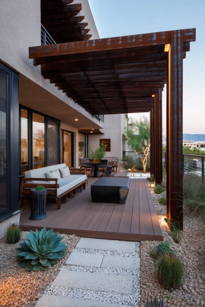 This incredible outdoor space showcases a bold desert-modern aesthetic, anchored by a truly dramatic Corten steel pergola that develops a beautiful, rich rust patina. This material choice provides amazing texture and a striking contrast to the clean, neutral stucco of the house and the warm dark composite decking. The pergola extends over a comfortable seating area, offering deep shade, and its heavy beams give the space a grounded, architectural feel. The landscaping is perfectly suited to a dry climate, featuring gorgeous succulents and native grasses set in a bed of light river rocks, creating a serene, low-maintenance garden. A simple path of concrete pavers leads through the rocks, tying the whole look together.