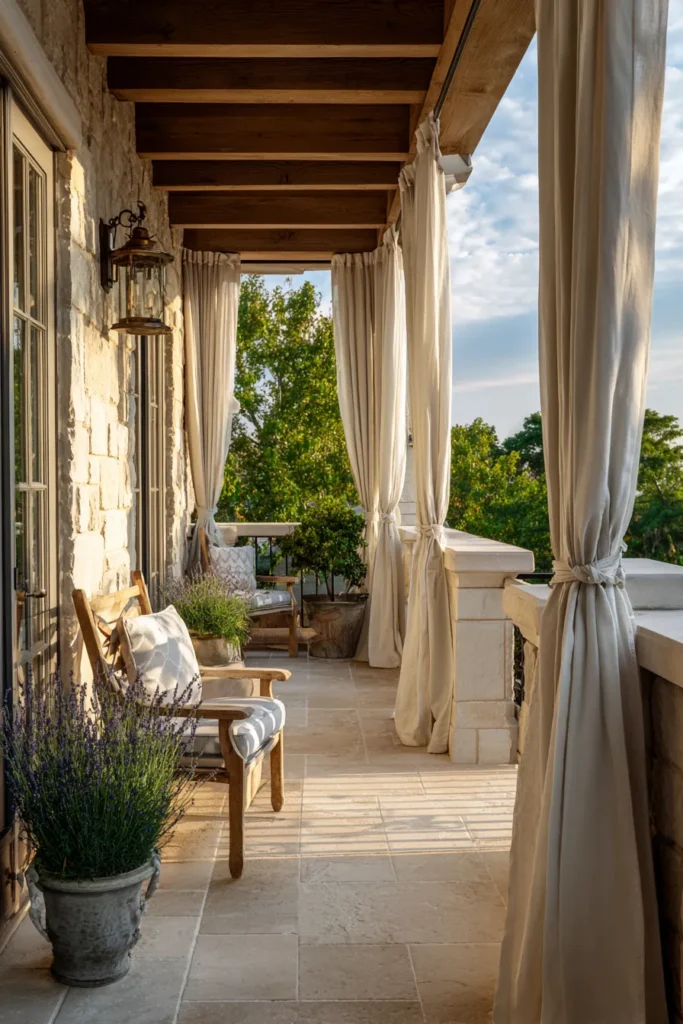 This stunning covered balcony evokes the timeless romance of a European countryside villa, combining rugged natural textures with soft, luxurious textiles. The exterior wall is clad in beautiful, rustic cut stone, providing a durable and beautiful backdrop to the entire space. The ceiling features exposed wooden beams, which serve as the structure for this integrated pergola, adding incredible warmth and architectural depth. What truly elevates this space are the lush, full-length cream curtains tied back to stone balustrades, offering adjustable privacy and a beautiful, airy movement. Terracotta planters filled with fragrant lavender complete the look, making it a peaceful, old-world retreat.