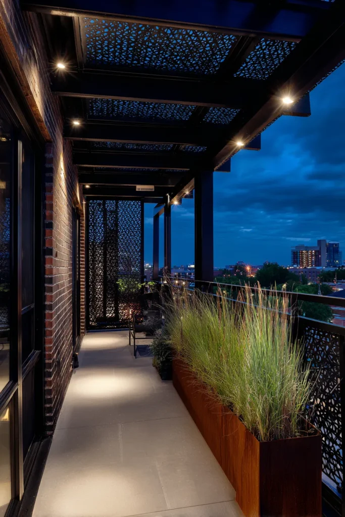 This sophisticated urban balcony showcases a high level of custom design, using rich textures and moody colors to create a spectacular evening retreat. The star of the show is the dark, heavy-duty metal pergola featuring a bespoke laser-cut screen overhead and along the railings, which casts beautiful patterned light and shadow across the floor. The brick wall provides a warm, historic contrast to the modern metalwork. Along the edge, a long Corten steel planter filled with vibrant, tall grasses adds a gorgeous pop of green and a touch of rustic, natural texture. Integrated spotlights highlight the intricate pergola details and floor, making the space feel magical after dark.