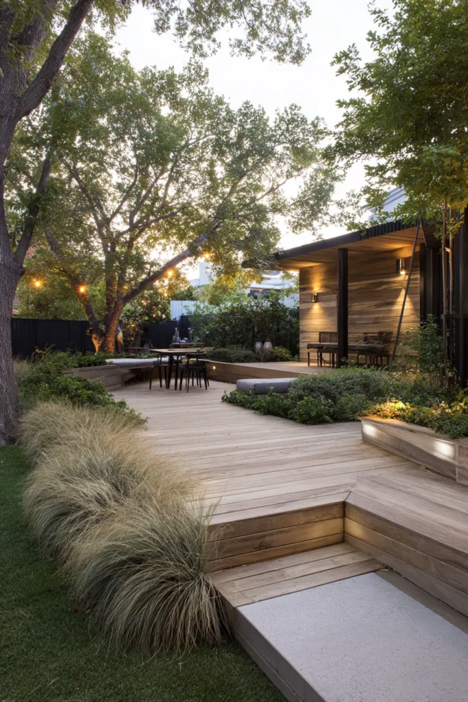 This deck design incorporates gentle steps that double as seating, creating a layered look while staying true to the floating concept. The warm wood tones and surrounding plants soften the structure and make it feel welcoming.