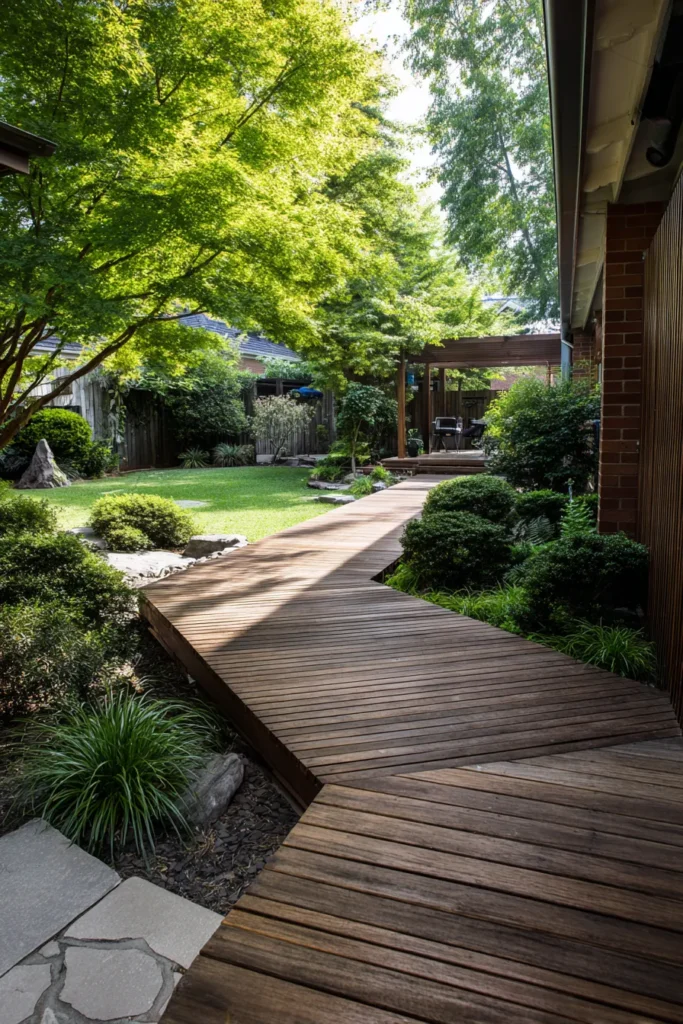 This floating deck acts as a pathway through a landscaped garden, guiding the eye and movement through the backyard. The wood surface contrasts beautifully with the greenery and stone accents, creating a natural and relaxed flow.