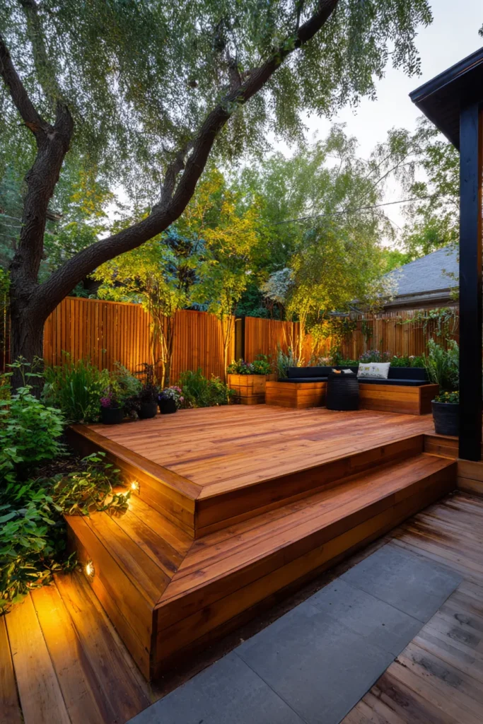 This floating deck features a beautiful tiered design with rich wood planks that create depth and gentle visual interest. Soft built in lighting highlights the steps and makes the deck feel warm and inviting, while the surrounding greenery and fencing add a sense of privacy and calm.