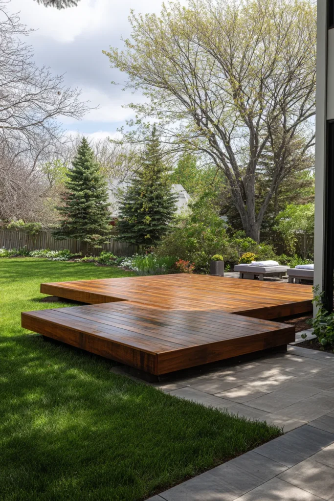 This floating deck uses angled boards and a flowing shape to guide movement through the backyard. The design feels dynamic while still sitting low to the ground, making it visually interesting and realistic to build.