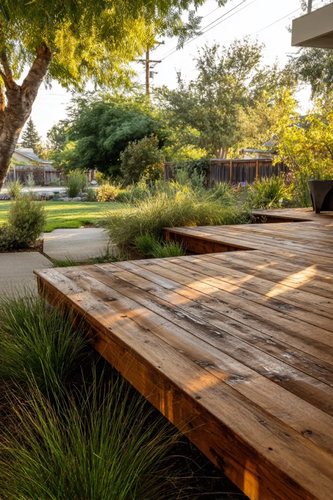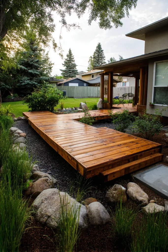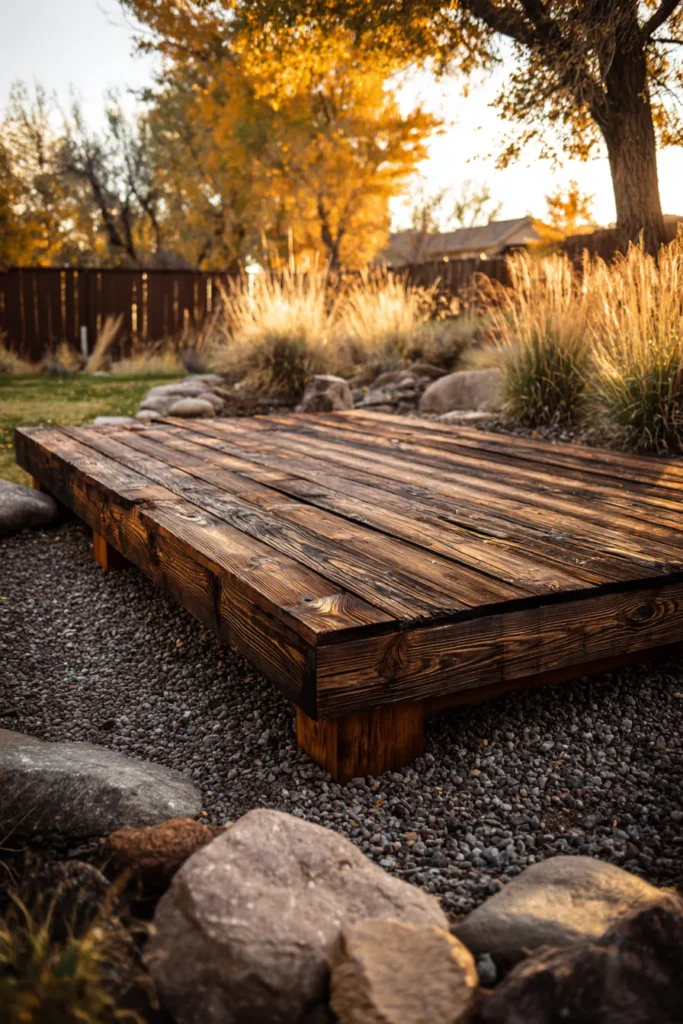 This design highlights a low floating deck built close to the ground using darker wood planks that contrast beautifully with the surrounding soil and stones. The organic placement and simple structure make it feel earthy and effortlessly blended into the landscape.
