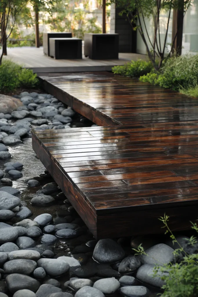 This deck sits gracefully above a bed of smooth decorative stones, creating a clean and intentional foundation without heavy construction. The rich wood surface adds warmth while the stone base gives it a modern and low maintenance feel.